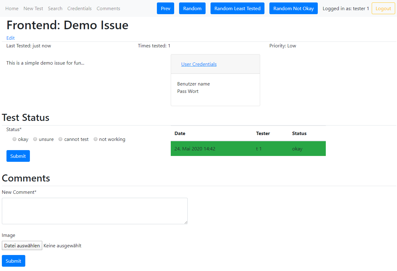 Once an issue has been created it is possible to add comments, images and set a status of the issue (“okay”, “unsure”, “cannot test”, “not working”). The history of status changes will be recorded on the right so it is easy to visually identify how stable an issue is and how carefully it needs to be tested again.
